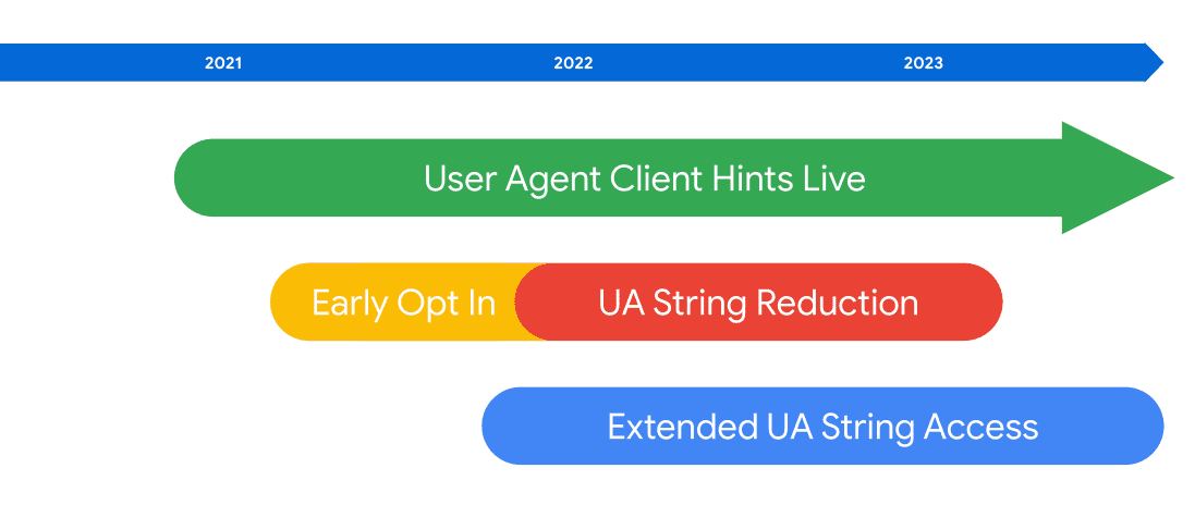 Em abril de 2022, a redução gradual da string do UA vai começar no Chrome. O UA-CH foi lançado e estava pronto para adoção em grande escala a partir de março de 2021. Você pode começar a testar e migrar para ele agora. Participe de um teste de origem para ativar a string de UA reduzida e ver como será o estado futuro.