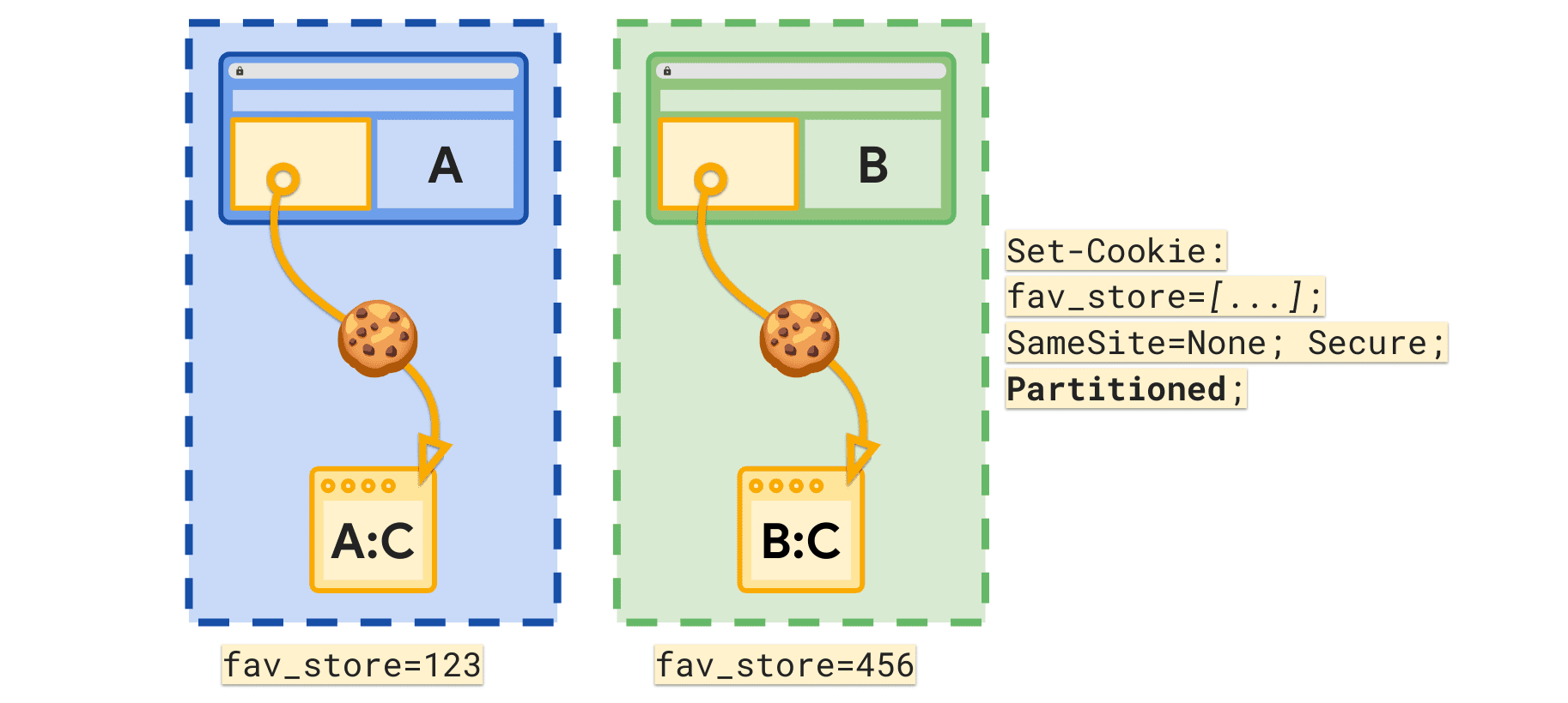 Partitioned를 설정하면 사이트는 최상위 사이트별로 분할된 별도의 쿠키 저장소에 쿠키를 저장하도록 선택합니다. 위 예에서 쿠키는 사용자가 즐겨 찾는 매장을 저장할 수 있는 매장 지도를 호스팅하는 store-finder.site에서 가져옵니다. CHIPS를 사용하면 brand-a.site가 store-finder.site를 삽입할 때 fav_store 쿠키의 값이 123입니다. 그런 다음 brand-b.site가 store-finder.site도 삽입하면 fav_store 쿠키의 자체 파티션된 인스턴스를 설정하고 전송합니다(예: 값 456).