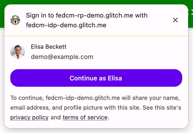 Continuation API を使用すると、IdP の ID アサーション エンドポイントは、必要に応じて、ユーザーが複数のステップからなるログインフローを続行できるように、FedCM がレンダリングする URL を返すことができます。これにより、IdP は、ユーザーのサーバーサイド リソースへのアクセスなど、既存の FedCM UI で可能な範囲を超える、信頼できるパーティ(RP)の権限を付与するようユーザーにリクエストできます。