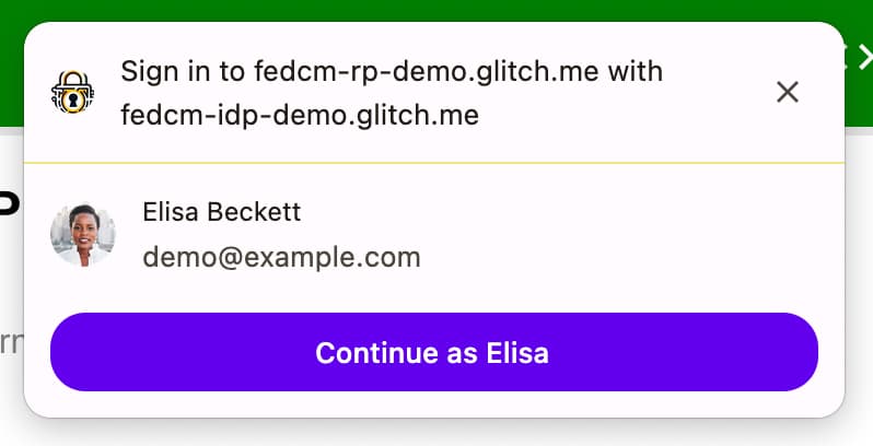 Continuation API, IdP'nin kimlik doğrulama uç noktasının isteğe bağlı olarak FedCM'nin kullanıcının çok adımlı oturum açma akışına devam etmesine olanak tanımak için oluşturacağı bir URL döndürmesine olanak tanır. Bu, IdP'nin kullanıcıdan, mevcut FedCM kullanıcı arayüzünde mümkün olanın ötesinde güvenen taraf (RP) izinleri vermesini (ör. kullanıcının sunucu tarafı kaynaklarına erişim) istemesine olanak tanır.