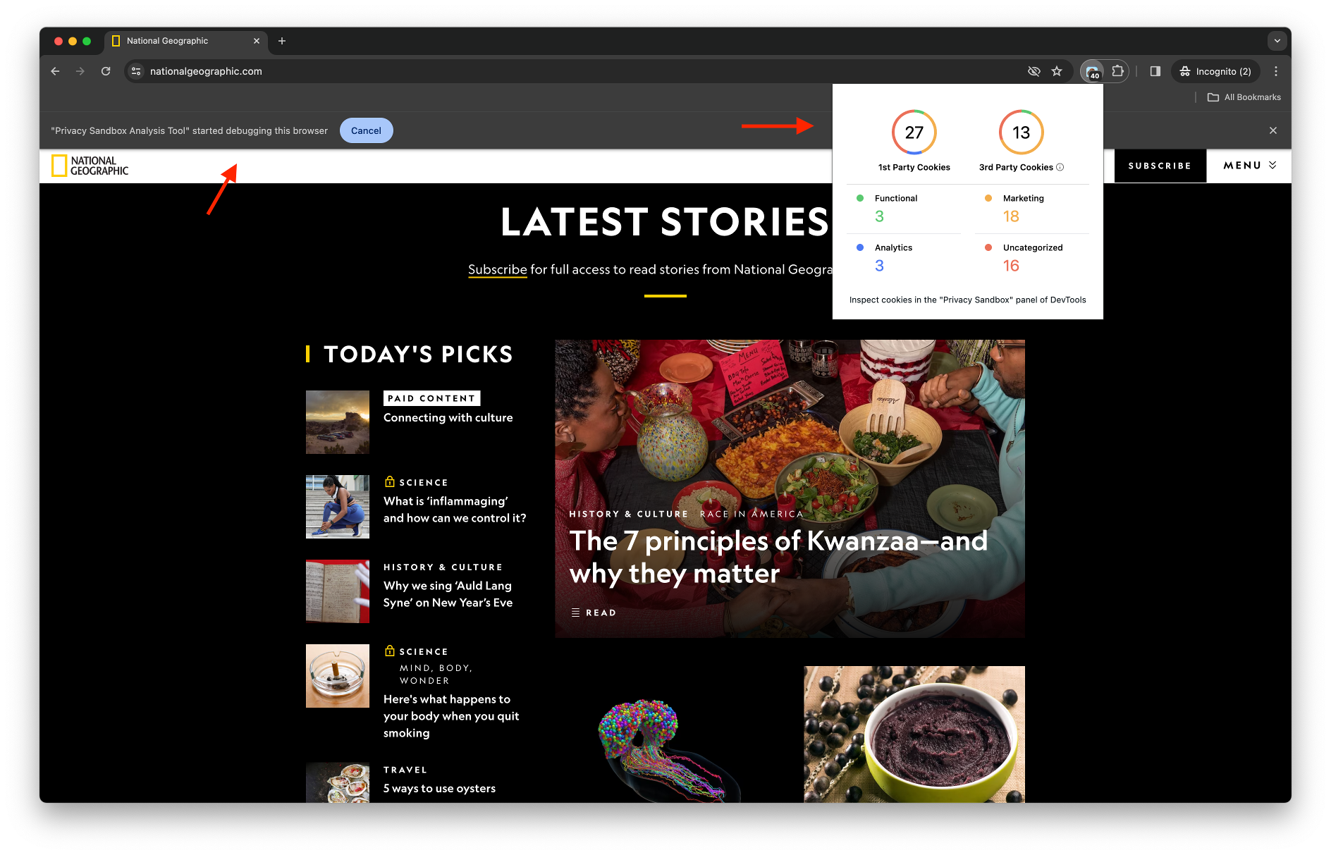 In Chrome wird links oben die Meldung „PSAT hat die Fehlerbehebung für diesen Browser gestartet“ angezeigt. Das bedeutet, dass PSAT das Chrome DevTools Protocol (CDP) verwendet, um die Verwendung von Drittanbieter-Cookies zu analysieren und zu beheben. In einer kommenden Version von PSAT können Entwickler CDP aktivieren und deaktivieren und nur während Debugging-Sitzungen verwenden. Weitere Informationen zu den Berechtigungsanforderungen für PSAT finden Sie auf der Wiki-Seite zum PSAT-Debugging.