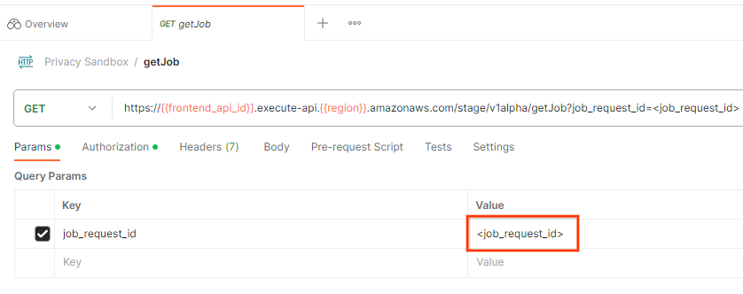 In "Params", aggiorna il valore job_request_id con il valore job_request_id inviato nella richiesta createJob.