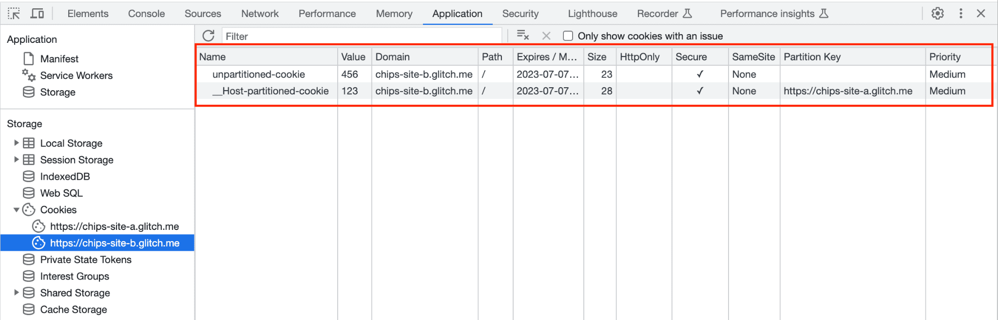 Pliki cookie z witryny B na karcie Aplikacja w Narzędziach deweloperskich. __Host-partitioned-cookie plik cookie ma klucz partycji https://chips-site-a.glitch.me. unpartitioned-cookie jest wyświetlana, ale nie jest dostępna dla elementu iframe witryny B, gdy jest osadzony w witrynie A.