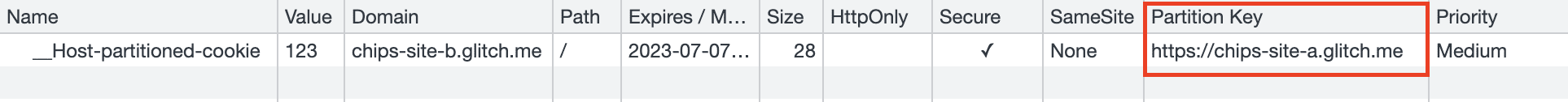 Находясь на сайте A, вы должны увидеть файл __Host-partitioned-cookie с ключом раздела сайта верхнего уровня https://chips-site-a.glitch.me .