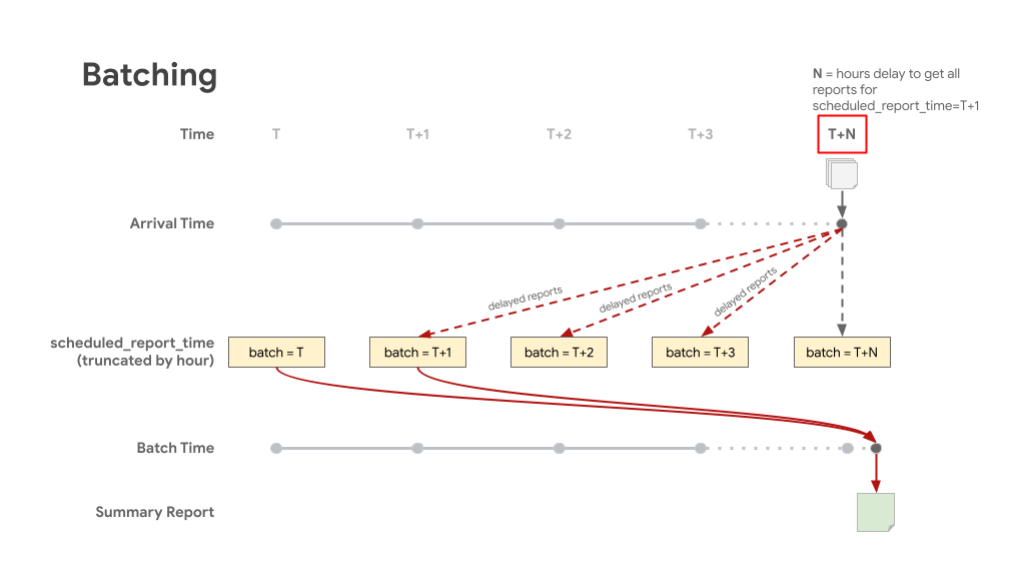 Recomendamos aguardar os relatórios que chegam atrasados ao coletar dados para o agrupamento em lote. Para saber se um relatório foi enviado com atraso, compare o valor de scheduled_report_time com a data de recebimento. A diferença de tempo entre esses relatórios ajuda a determinar quanto tempo você precisa esperar para receber os relatórios atrasados. Por exemplo, à medida que os relatórios atrasados são coletados, verifique o campo scheduled_report_time e observe o atraso em horas à medida que 90%, 95% e 99% dos relatórios são recebidos. Esses dados podem ser usados para determinar quanto tempo esperar pelos relatórios que chegam atrasados.