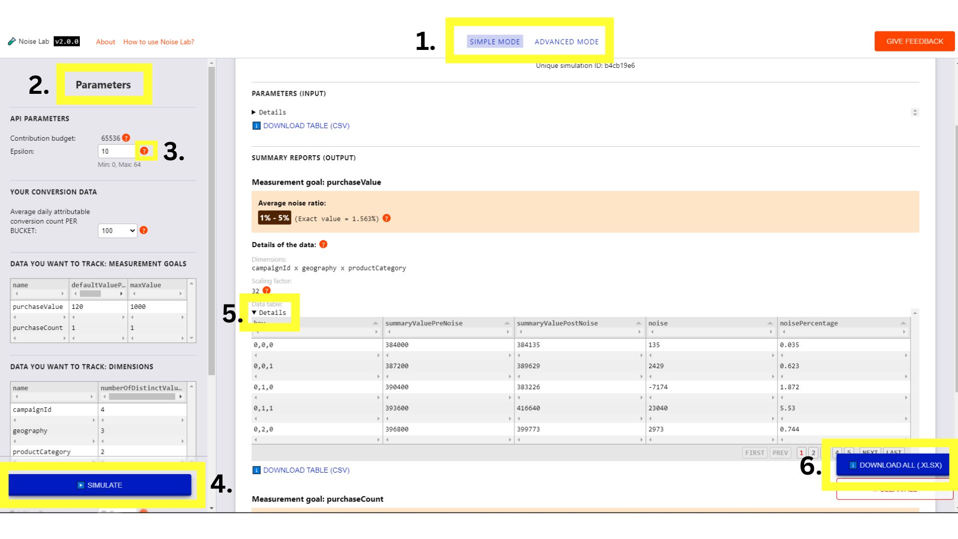8. Nota che i rapporti di rumore sono ora più elevati: questo perché quando hai meno conversioni per bucket, viene applicato più rumore per mantenere la privacy.