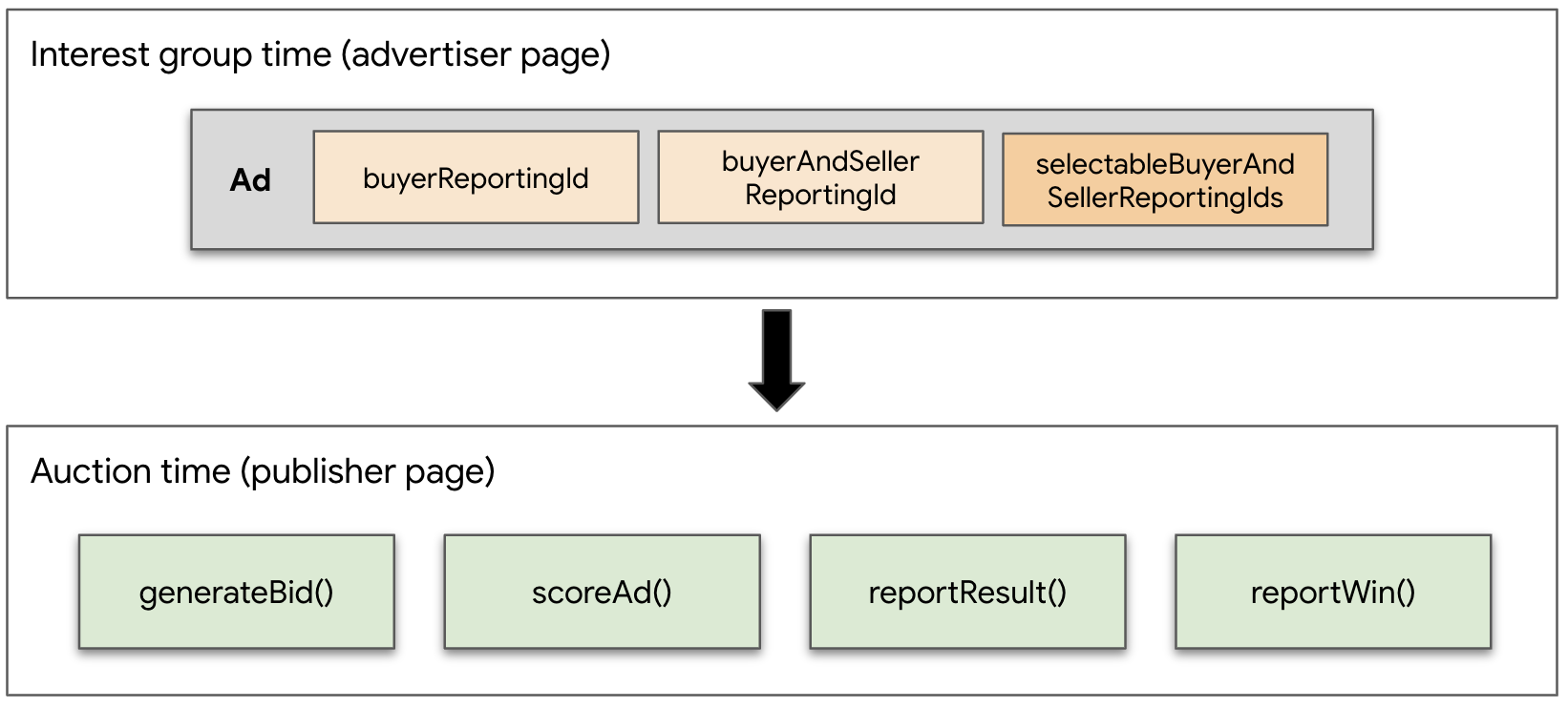 Per i report dei venditori, il selectedBuyerAndSellerReportingId restituito dall'acquirente da generateBid() diventa disponibile in reportResult(), insieme a buyerAndSellerReportingId, se è stato definito nel gruppo di interesse.