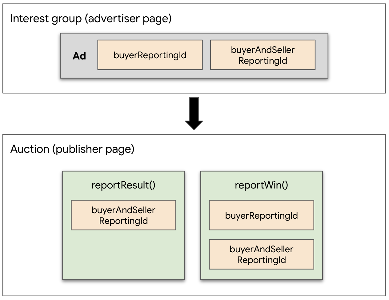 buyerReportingIdbuyerAndSellerReportingId は、インタレスト グループ設定で定義された選択不可のレポート ID で、購入者と販売者のレポート機能で使用できます。購入者と販売者のレポート機能は、落札した広告に対してのみ実行され、その広告に定義されたレポート ID を受け取ります。