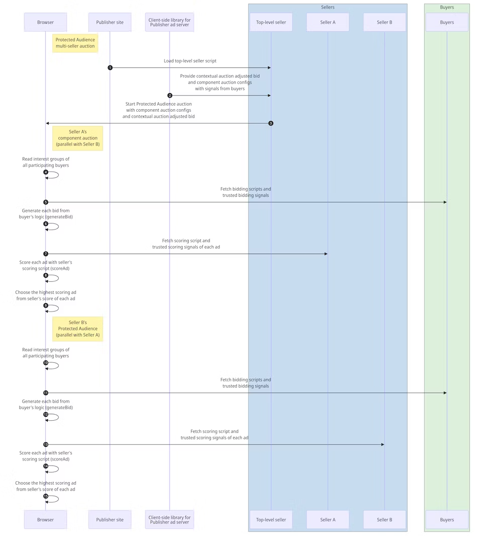 perBuyerSignals) and seller's component auction configs gathered by Prebid.js can be passed into the Protected Audience auction by the Publisher Ad Server's client-side library. - The Protected Audience multi-seller auction is executed by the top-level seller. During the top-level seller's scoring step, the top-level seller may compare each component auction winning bid price against the contextual auction adjusted winning bid price. If the component bid price is lower than the contextual auction bid price, then the top-level seller returns the desirability score of
