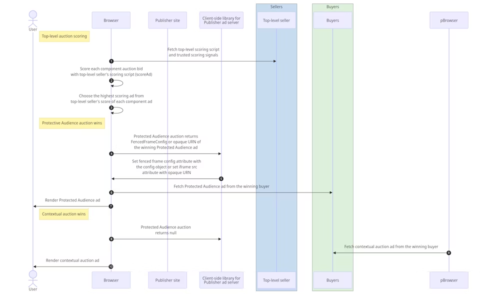 scoreAd()du vendeur de premier niveau). - Le vendeur de premier niveau lance les enchères Protected Audience en appelant
