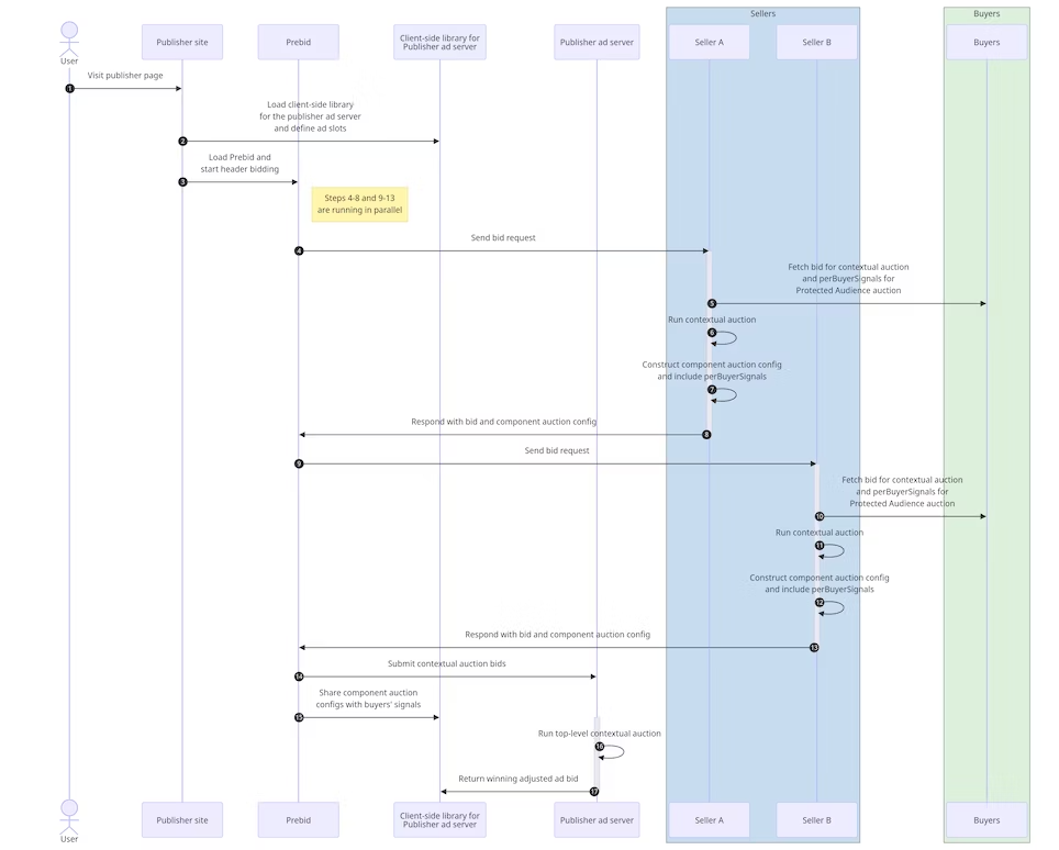 L'éditeur lance d'abord une enchère contextuelle d'enchères d'en-tête en appelant Prebid.js avec un indicateur pour indiquer qu'une enchère Protected Audience sera exécutée par la suite. Prebid.js collecte ensuite les réponses aux enchères et les envoie à l'ad server de l'éditeur pour une mise aux enchères contextuelle côté serveur. Lors de l'étape de collecte des réponses aux enchères, les acheteurs et les vendeurs ont la possibilité de fournir des configurations d'enchères de composants et des signaux d'acheteurs (perBuyerSignals) à utiliser pour l'enchère Protected Audience suivante, s'ils souhaitent y participer. Cette configuration d'enchères de composants sera ensuite transmise à l'enchère Protected Audience suivante.
