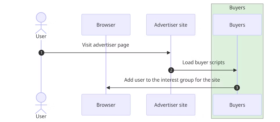 Avant l'enchère, lorsque l'utilisateur consulte la page d'un annonceur, l'acheteur et l'annonceur peuvent définir le groupe d'intérêt du site auquel appartient l'utilisateur, et ajouter des données contextuelles provenant du site de l'annonceur et des données first party à utiliser ultérieurement comme signaux pour l'enchère.