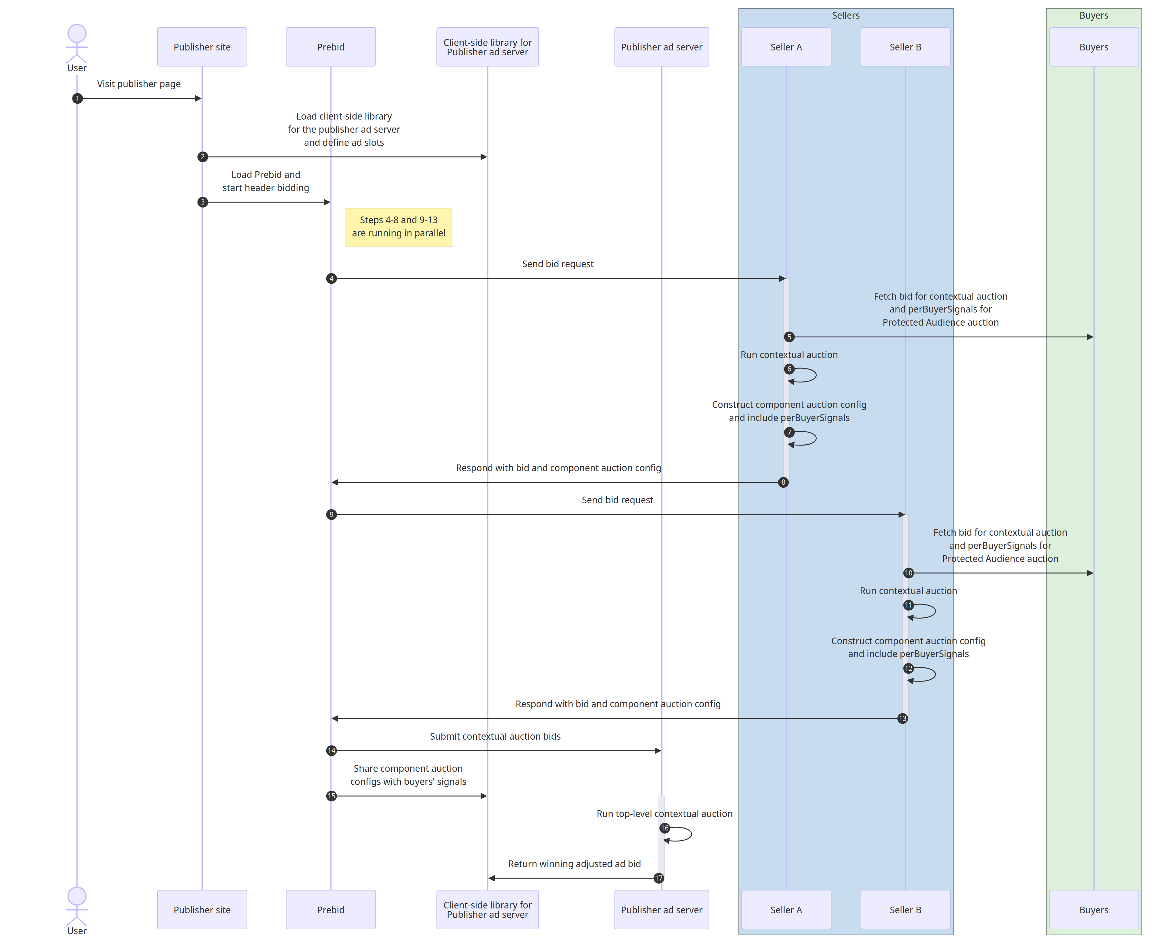 在連續競價設定中,所有內容相關競價都會在 Protected Audience 競價執行前完成。在本文件說明的設定中,我們透過 Prebid.js 執行標頭出價情境式競價,並透過發布商廣告伺服器提供伺服器端競價。