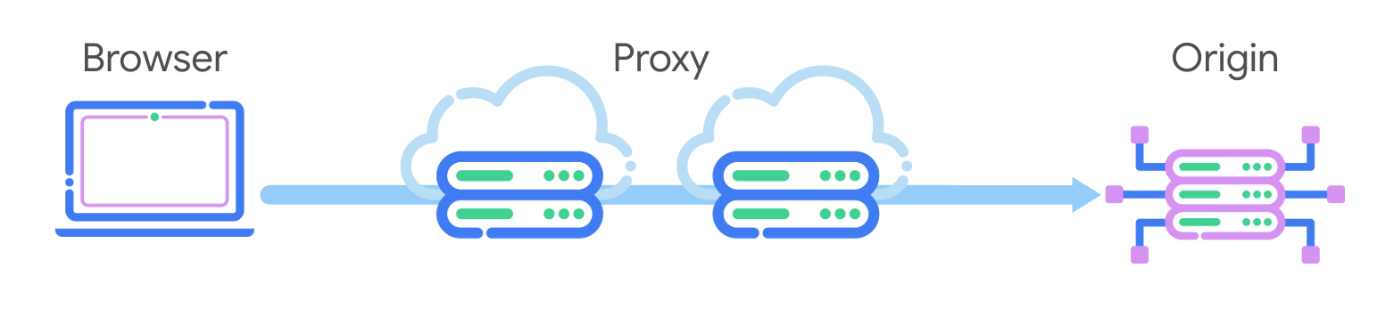 • O primeiro servidor proxy, operado pelo Google, vê apenas o IP do usuário e uma solicitação para se conectar ao segundo servidor proxy. O primeiro servidor proxy não vê o endereço IP de destino nem o conteúdo da solicitação.