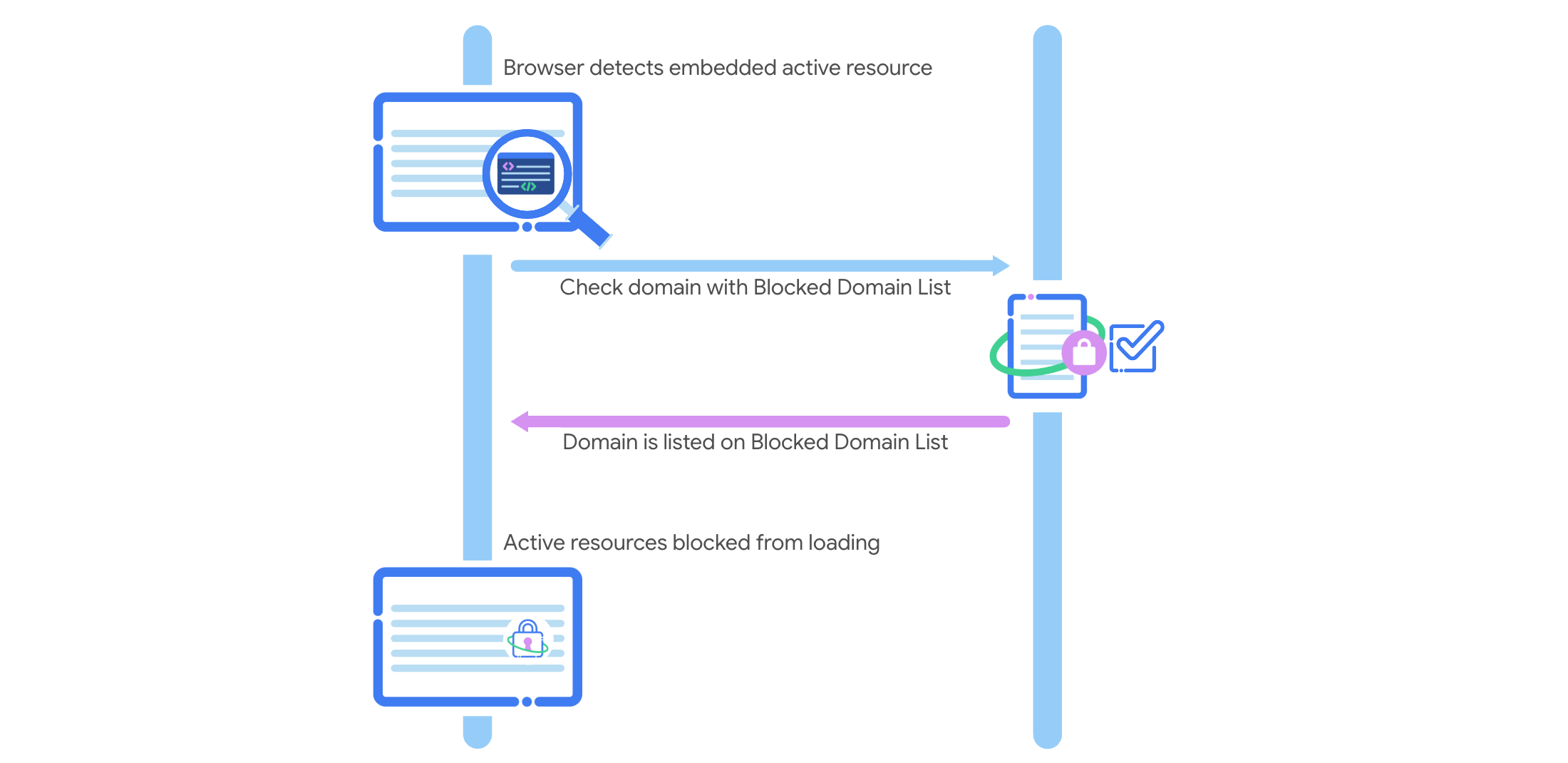 इस सुविधा के चालू होने पर, Chrome नेटवर्क के अनुरोधों की जांच, MDL के हिसाब से करता है. जब किसी डोमेन से मैच होता है, तो उस डोमेन के चालू रिसॉर्स (जैसे कि स्क्रिप्ट या iframe) ब्लॉक कर दिए जाते हैं. ये रिसॉर्स, कोड को एक्ज़ीक्यूट कर सकते हैं या वेब पेज पर कार्रवाइयां कर सकते हैं. हालांकि, स्टैटिक रिसॉर्स (जैसे कि इमेज और स्टाइलशीट) ब्लॉक नहीं किए जाते.