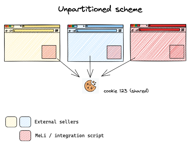 في الوقت الحالي، تتيح ملفات تعريف الارتباط المقسّمة لشركة Mercado Libre الاحتفاظ بمعلومات تحديد الجهاز من خلال ضبط ملف تعريف ارتباط منفصل لكل موقع إلكتروني من المستوى الأعلى. كما هو موضّح في الصورة التالية، يحافظ هذا النهج على الخصوصية، لأنّه يحدّ من مشاركة المعلومات في جميع المتاجر. يتم استخدام ملفات تعريف الارتباط المقسّمة عندما لا تكون ملفات تعريف الارتباط التابعة لجهات خارجية متاحة. ويؤدي ذلك إلى حظر مشاركة المعلومات في جميع المتاجر، ما يؤدي إلى تحسين خصوصية المستخدم.